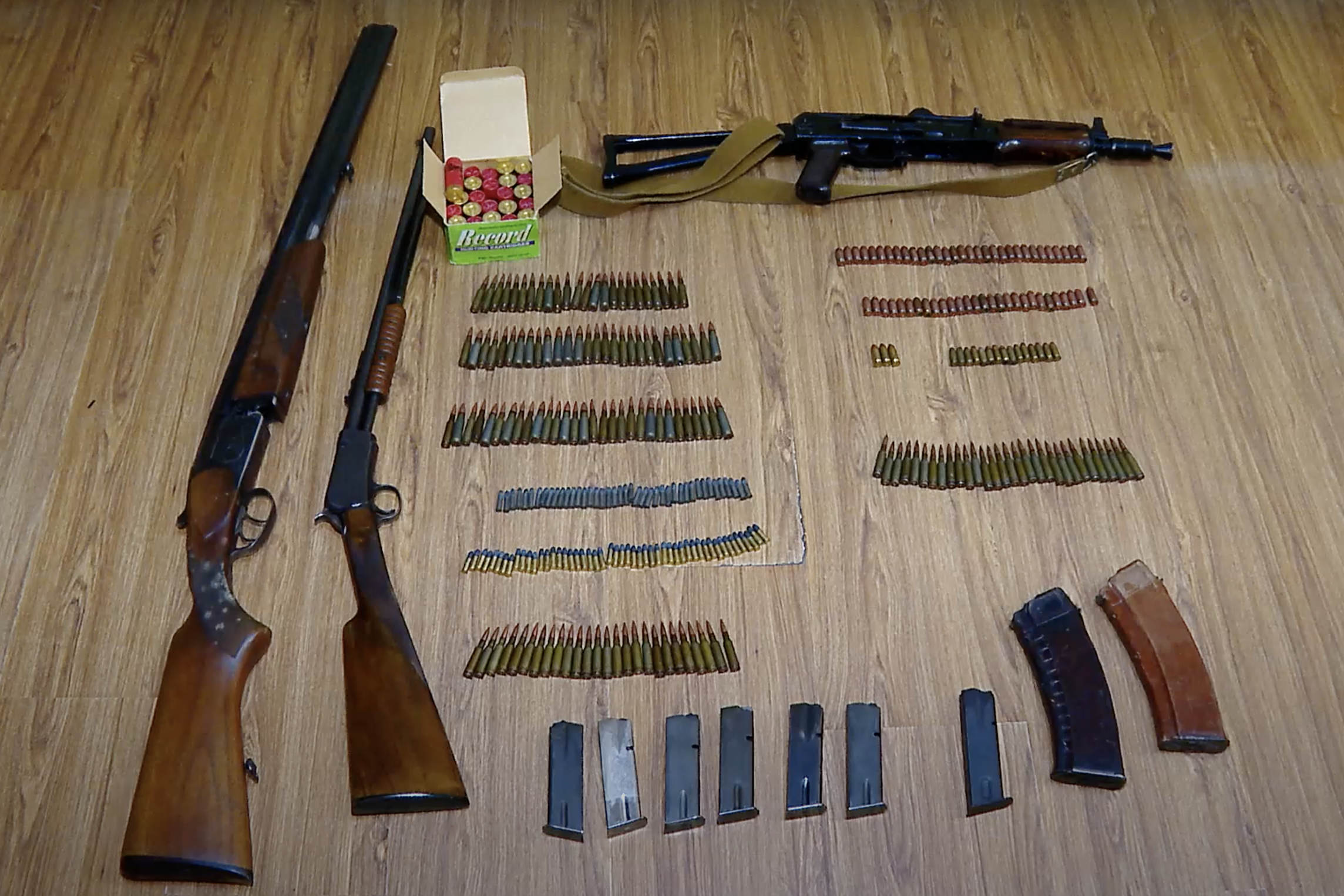 По итогам личных досмотров, а обысков домов и машин задержанных полицейские изъяли пистолеты, револьверы, автомат, охотничье ружье, приклады, патроны, глушитель.