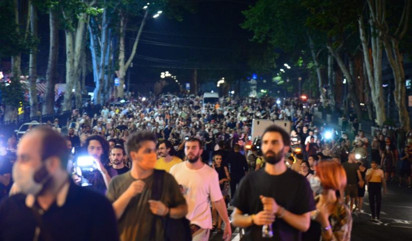 ТБИЛИСИ, 12 июля – Новости-Грузия. Участники акции протеста, которая вечером началась на проспекте Руставели, устроили шествие к офису правящей партии «Грузинская мечта». Там их встретил плотный полицейский…