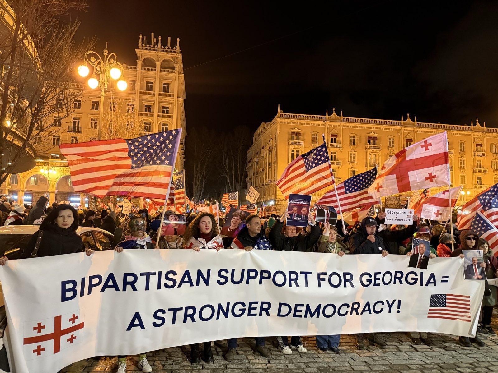 Участники митинга держат американские флаги, портреты Дональда Трампа, конгрессмена Джо Уилсона, который является автором законопроекта, а также сенатора Джима Риша, представившего инициативу верхней палате Конгресса. Некоторые протестующие принесли плакаты с призывами ко введению санкций против лидеров правящей «Грузинской мечты».