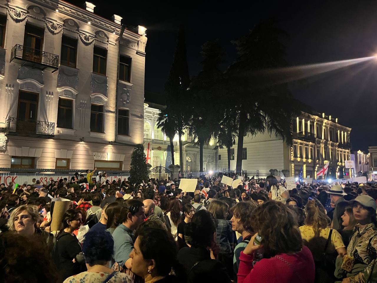 В субботу сотни участников акции против закона об иноагентах провели шествие ко Дворцу Орбелиани. Там они поблагодарили Зурабишвили за поддержку, готовность наложить вето на спорную инициативу «Грузинской мечты» и помилование единственного осужденного участника прошлогодних протестов против этого же закона Лазере Григориадиса.