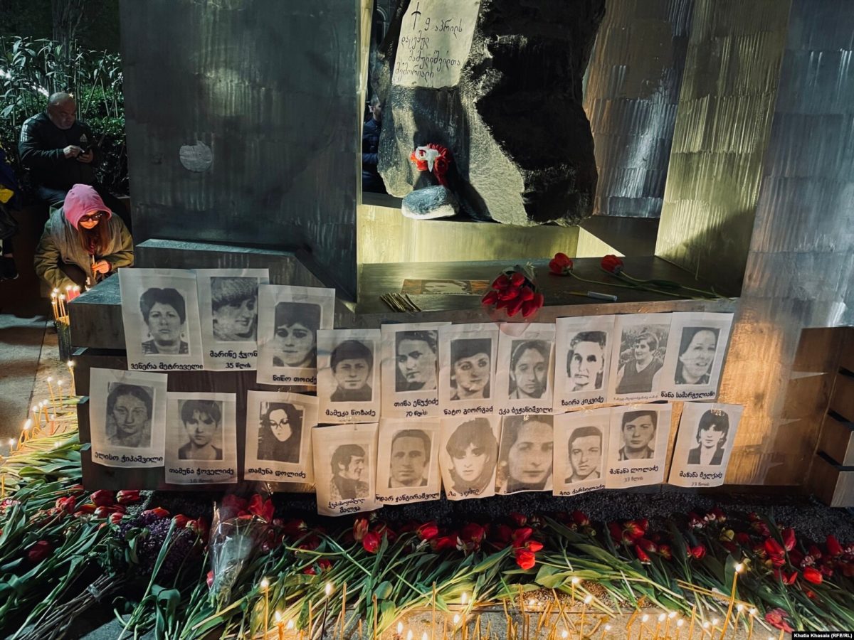Перед парламентом Грузии 9 апреля сегодня были экспозиции из двух списков с фотографиями: имена 21 погибших 9 апреля 1989 году и нескольких десятков задержанных за последние месяцы участников проевропейских протестов, которым предъявлены обвинения по уголовным статьям и грозят серьезные сроки заключения. Те, кто участвуют в акциях протеста и требуют новых выборов, считают «узников совести» такими же героями, как и тех, кто 36 лет тому назад стоял на проспекте Руставели.
