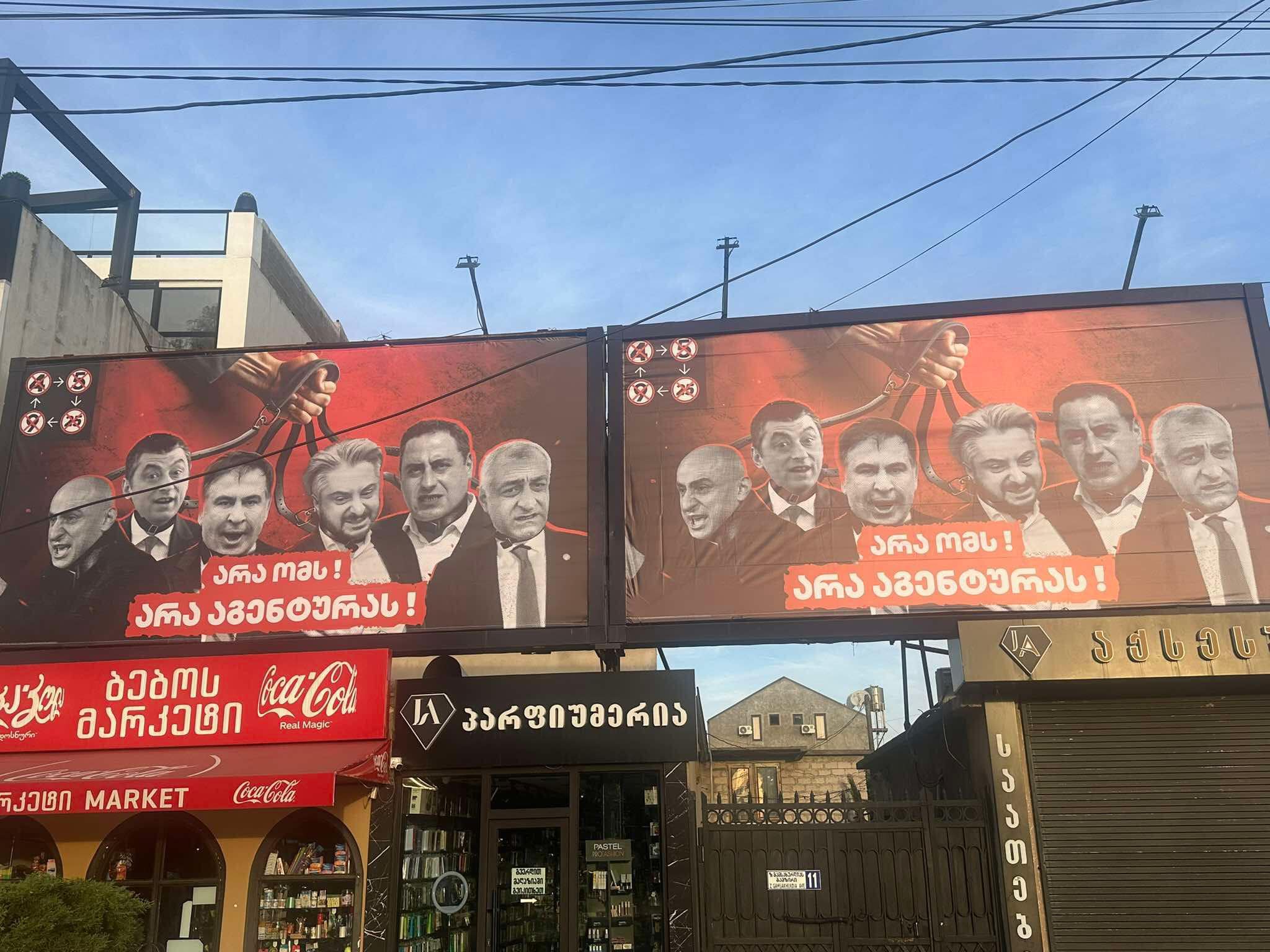 На баннерах лидеров основных прозападных партий – Ника Мелия, Ника Гварамия, Георгий Вашадзе, Мамука Хазарадзе, Михаил Саакашвили – изобразили на поводках. Слоган гласит «Нет войне! Нет агентуре!».