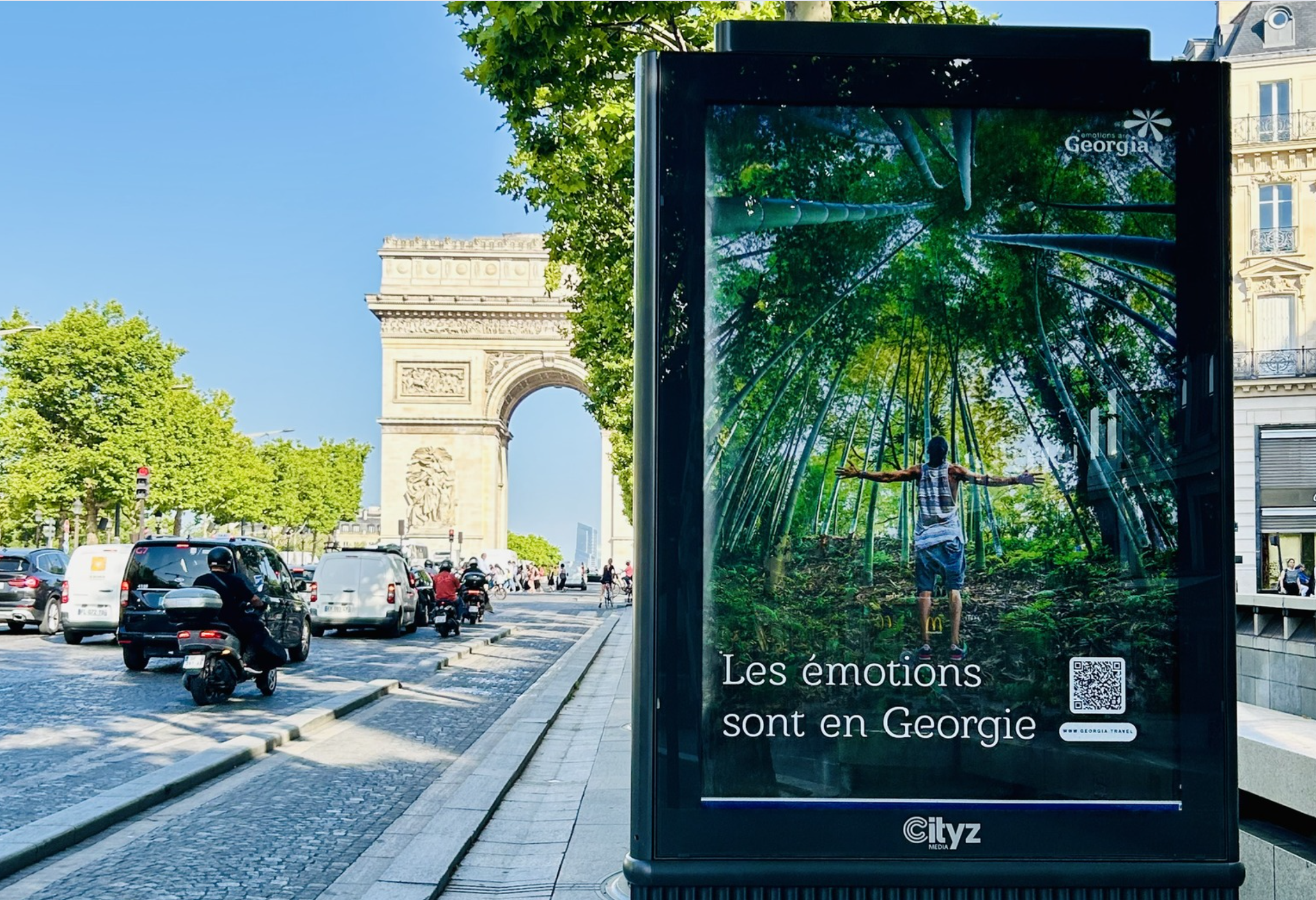 Баннеры с грузинскими достопримечательностями размещены в самых оживленных районах французской столицы – на Елисейских Полях, площади Шарля де Голля и других популярных туристических локациях.