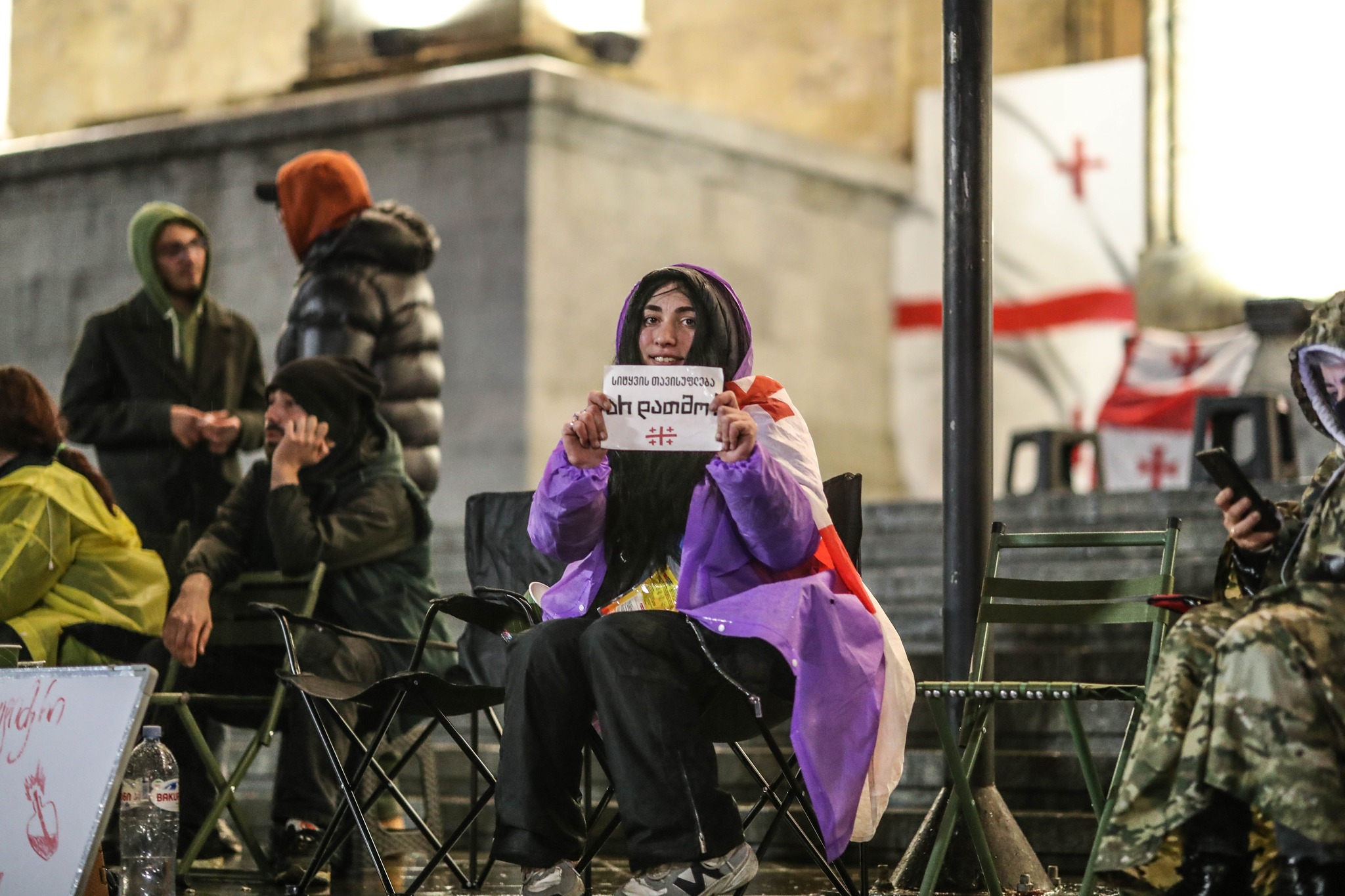 В момент инцидента у парламента находилось около десятка человек. Когда позже к ним присоединились сотни других протестующих, на Руставели демонстративно принесли стулья. В этом случае полиция не препятствовала демонстрантам.